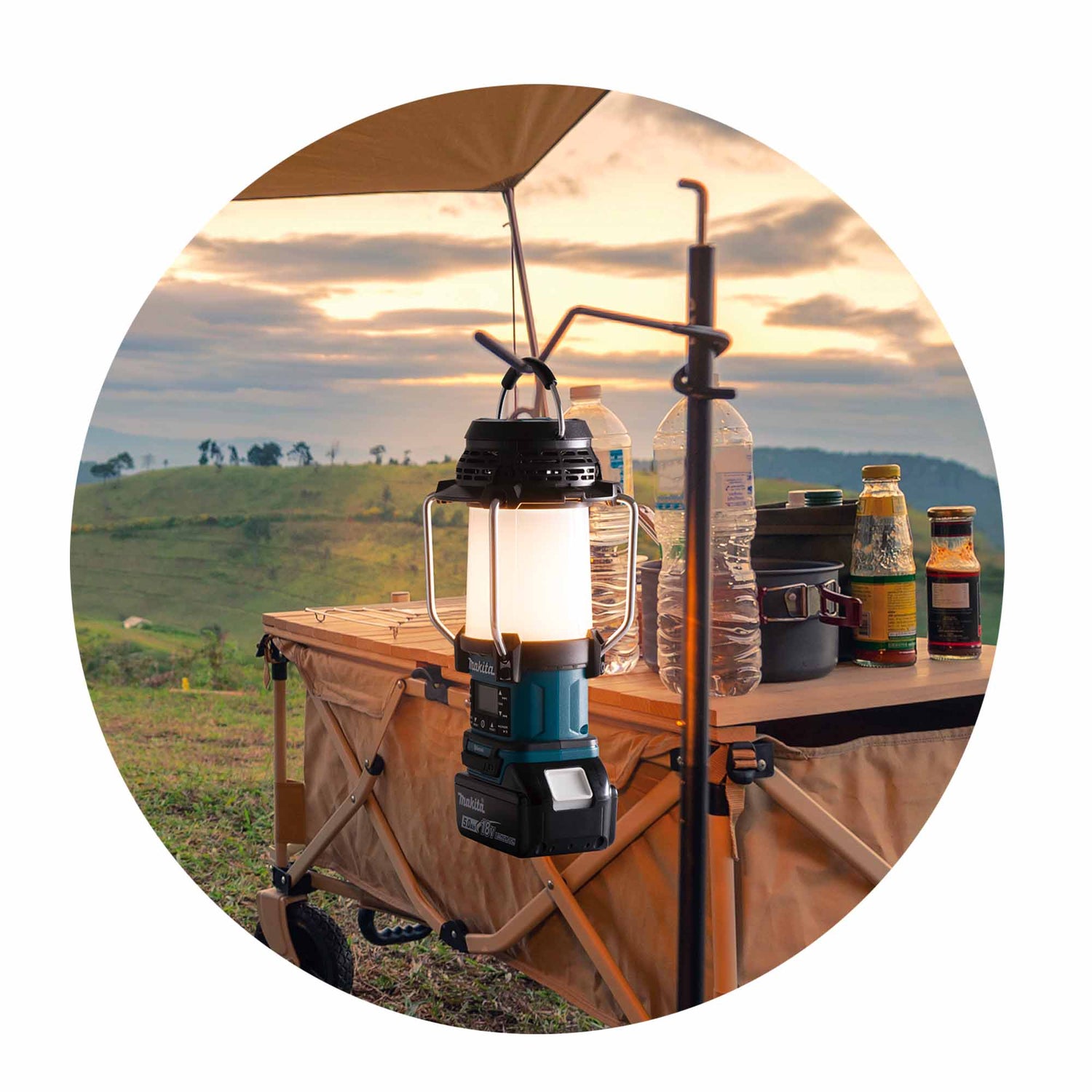 Radio Lantern Makita DMR057 18V integrated light fixture (lantern) with different light settings.