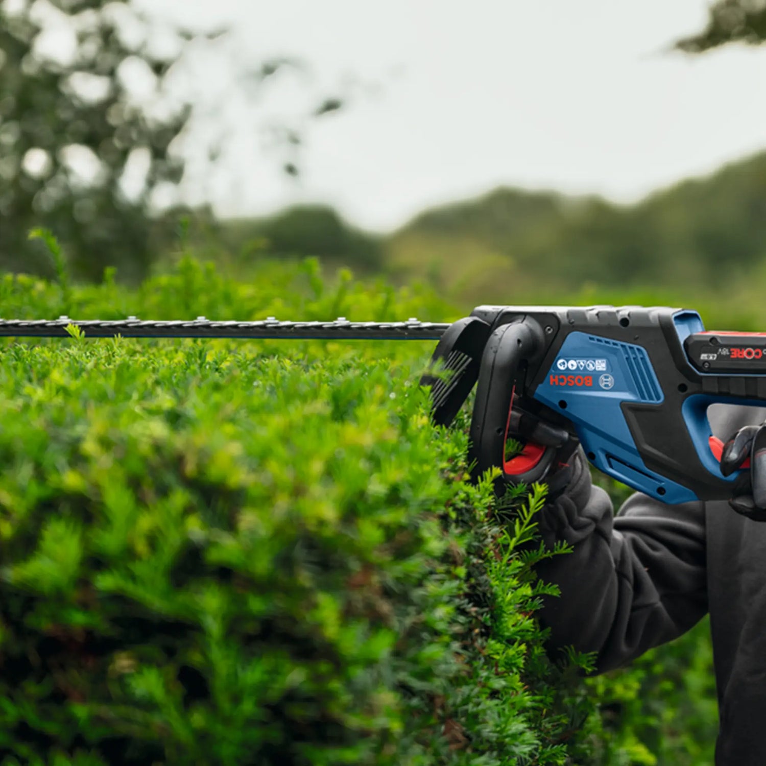 The Hedge Trimmer Bosch GHE 18V-60 II, lightweight and high performance with added flywheel for smoother cutting.