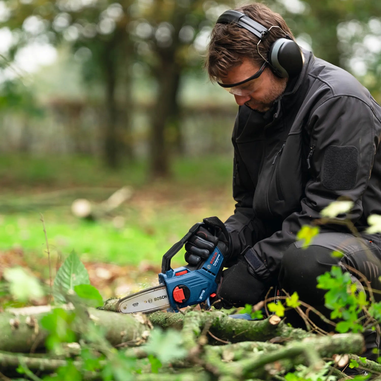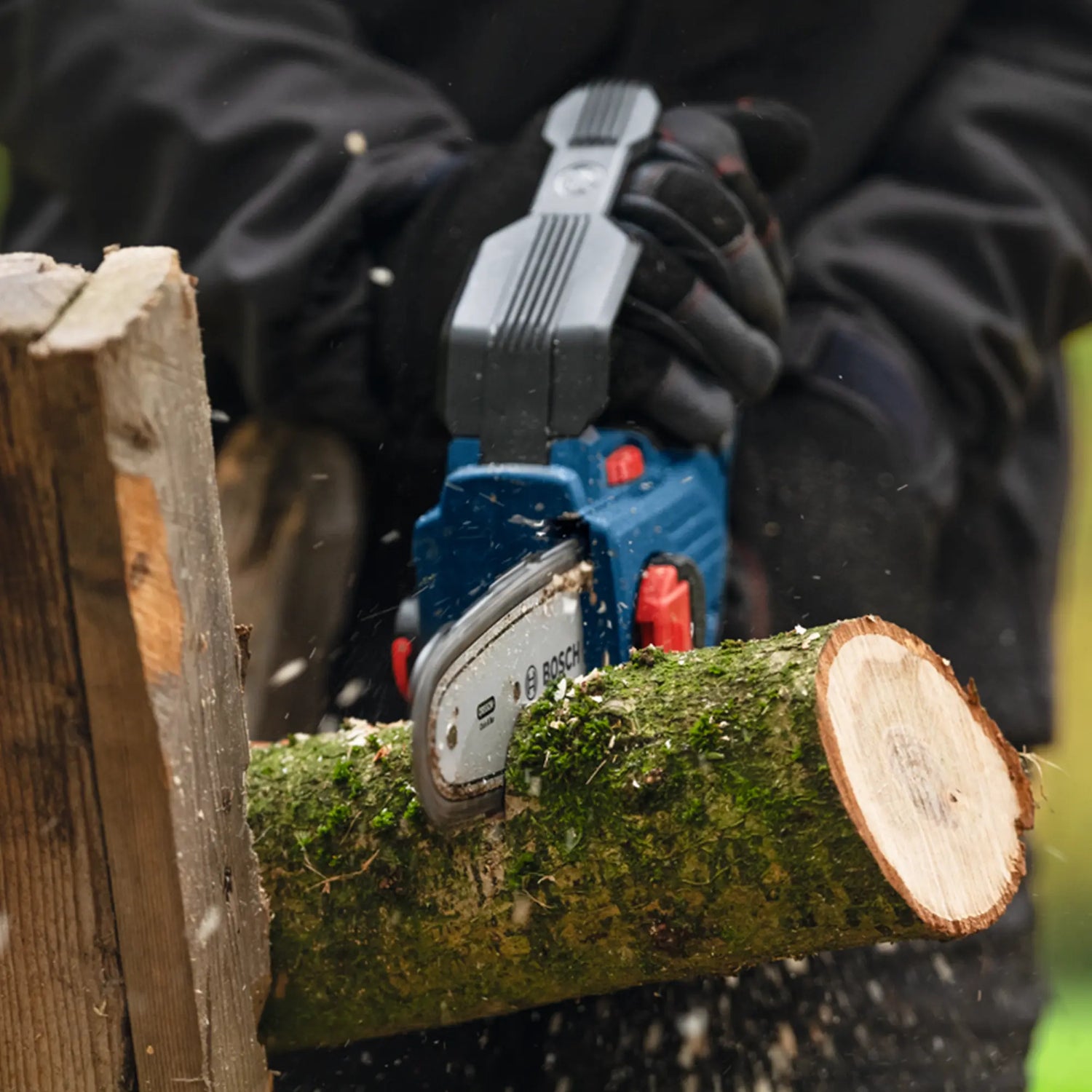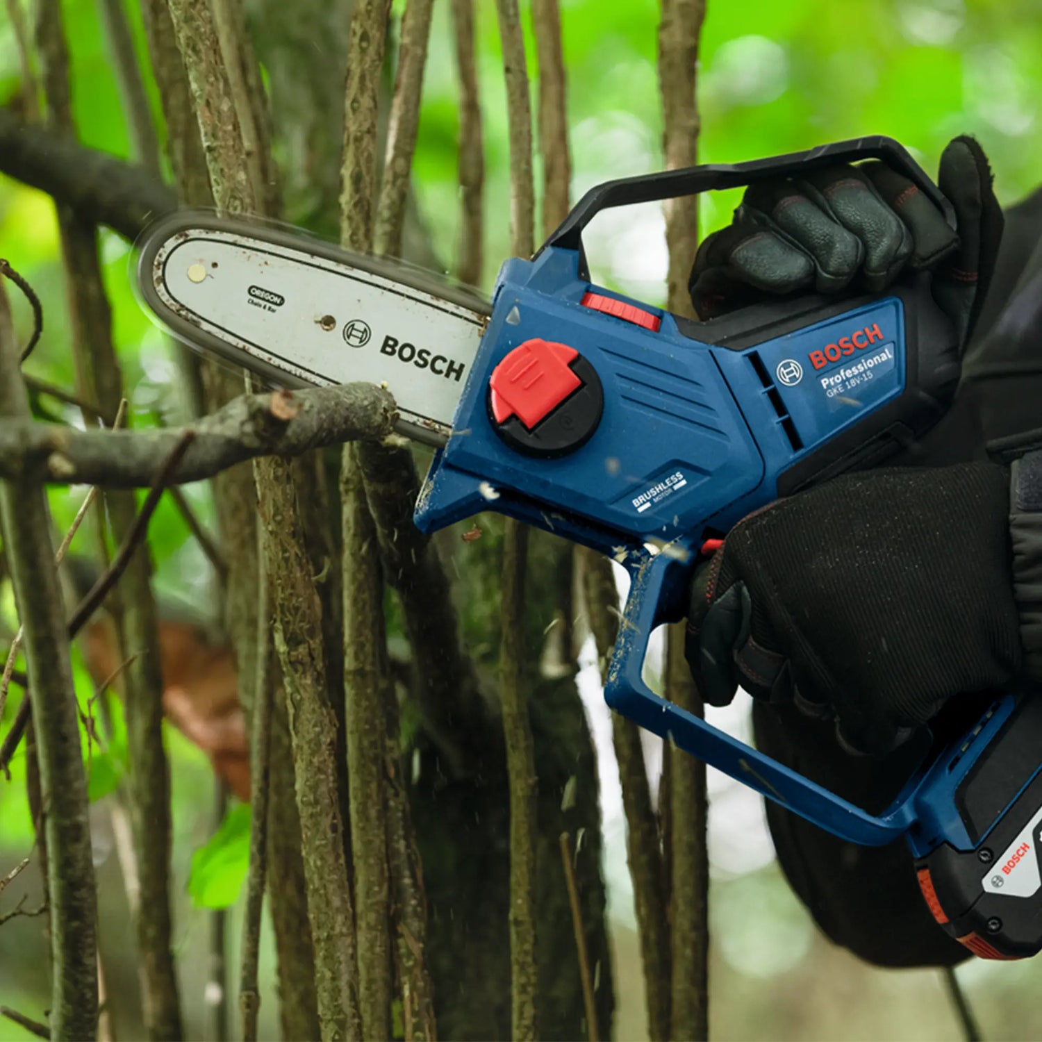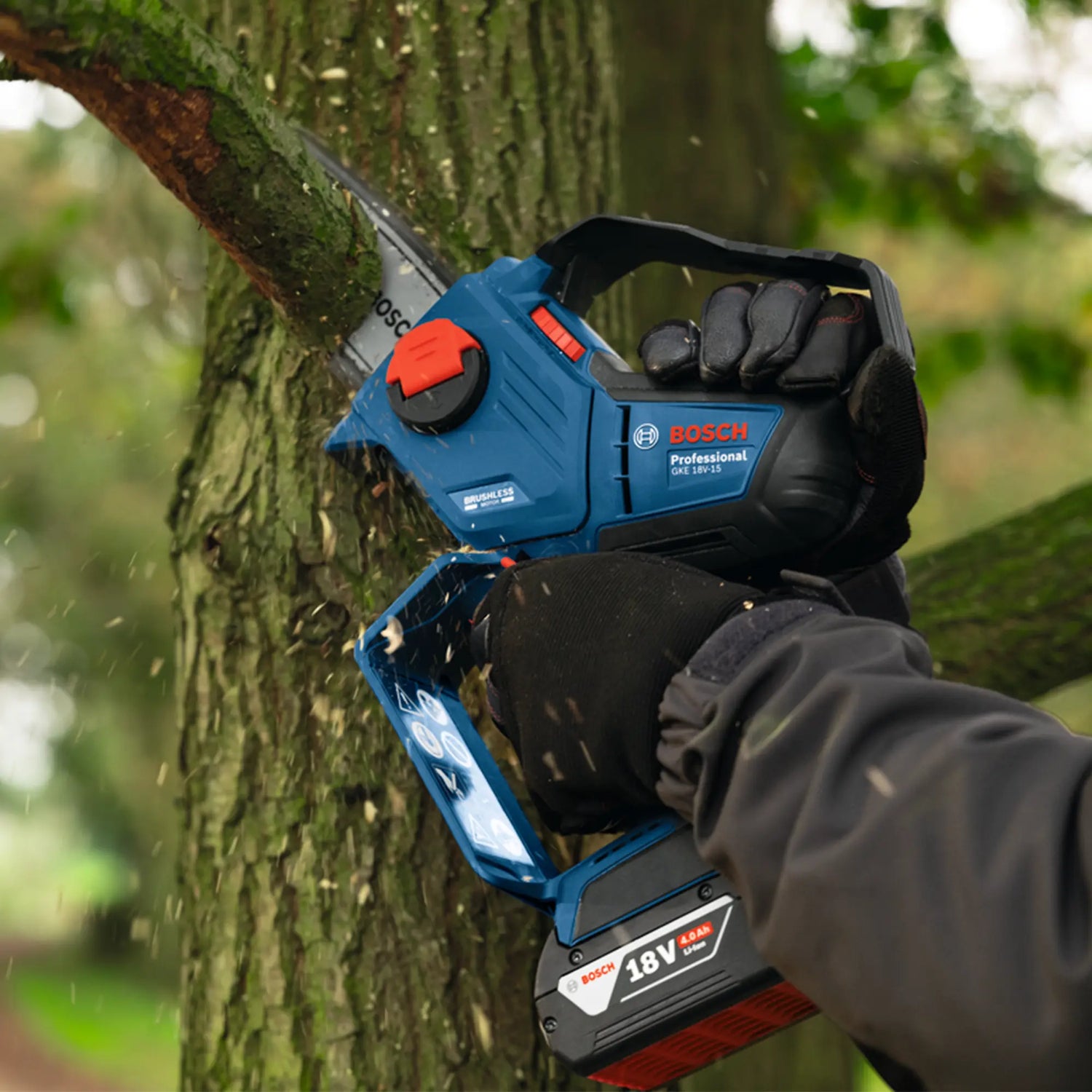 The Pruner Bosch GKE 18V-15, lightweight, high-performance pruning saw, perfect for cutting in tight spaces.