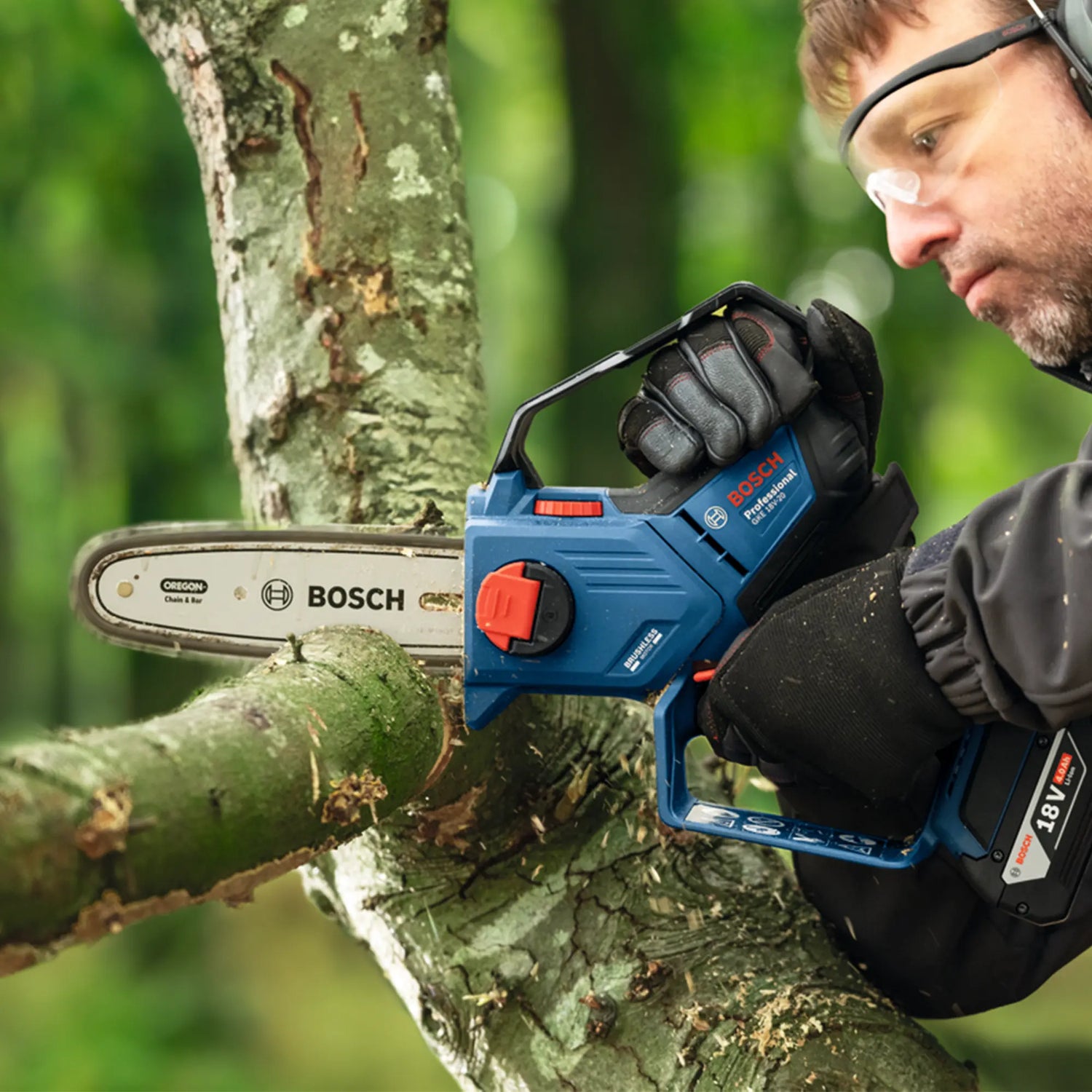 The Pruner Bosch GKE 18V-15, lightweight, high-performance pruning saw, perfect for cutting in tight spaces.