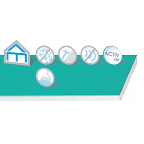 Special coated plasterboard, with increased core density, whose plaster is also reinforced with glass fibres (type DI) and with reduced water absorption (type H1): these characteristics give the product a high degree of surface hardness and mechanical resistance and an excellent seal in the presence of high levels of humidity. The plasterboard, coupled on one side with a membrane in EPDM And anti-vibration with a green colour, made in Italy and free from VOC.