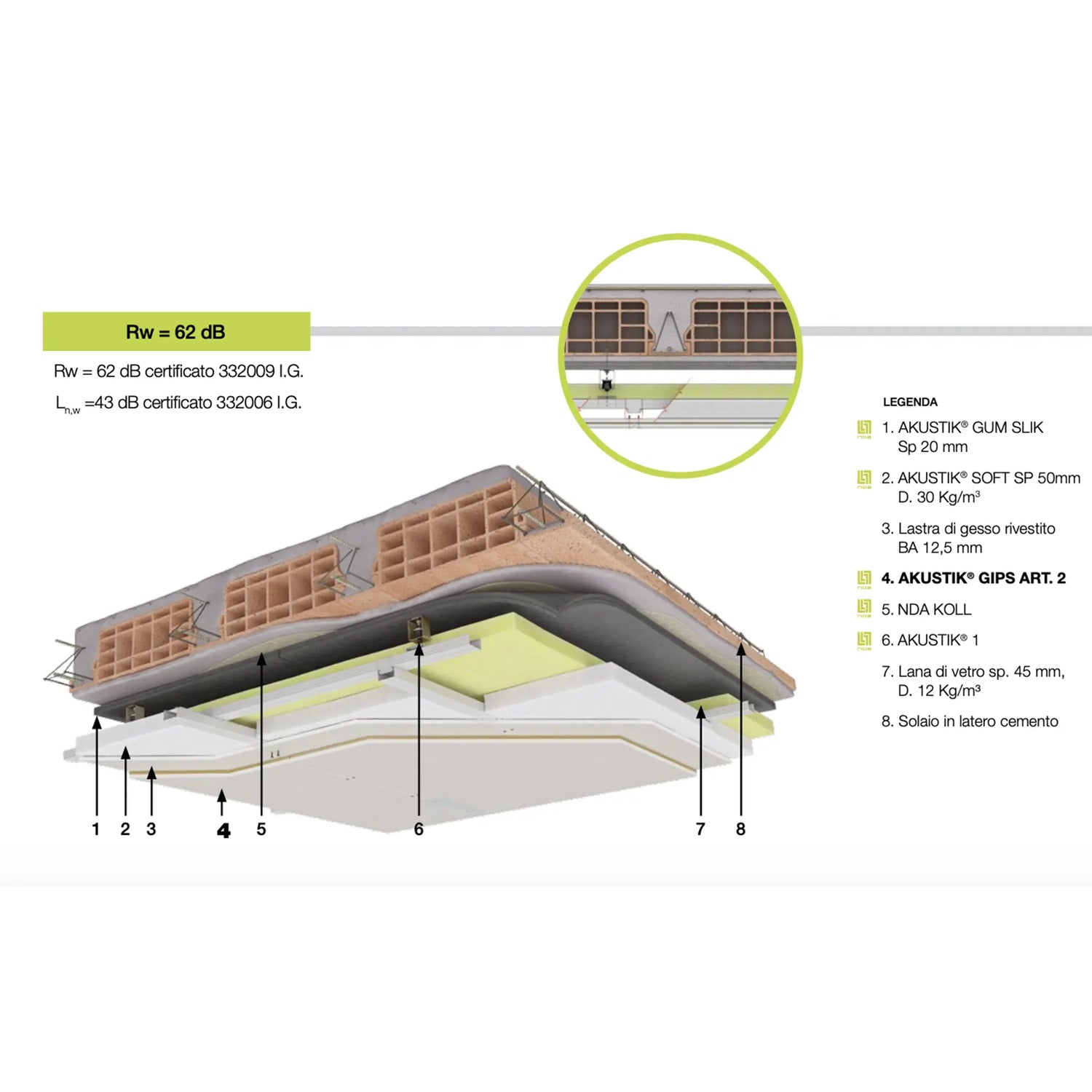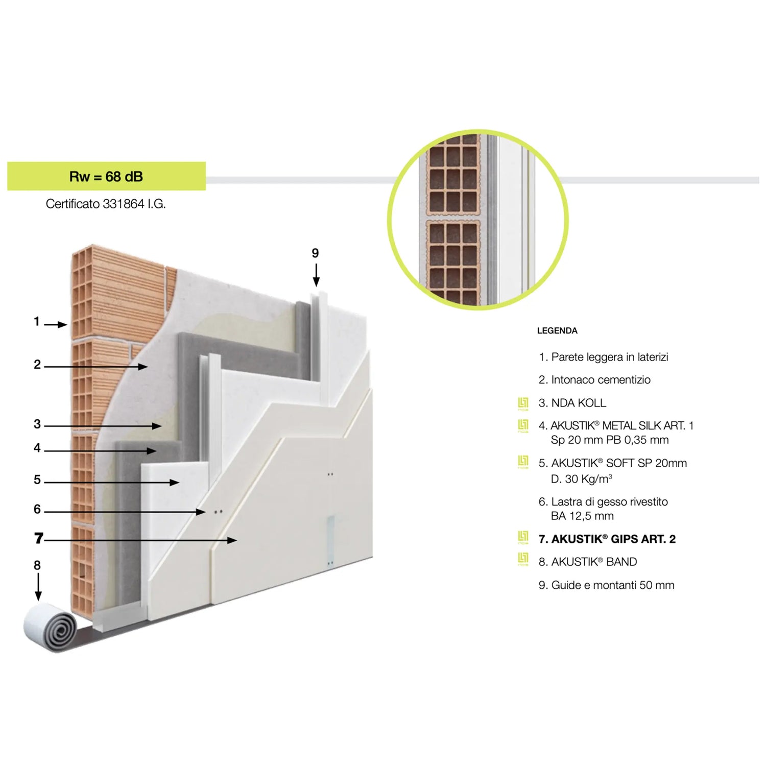 The NDA Akustik Gips Art2 Coupled Panel It is the ideal solution to obtain high sound insulation performance in plasterboard walls, false walls and false ceilings. This special double-layer plate It is composed of a panel in 12.5 mm plasterboard coupled with a TECSOUND® EPDM soundproofing and vibration-proof mass 2.5 mm, with a density of 5 kg/m².