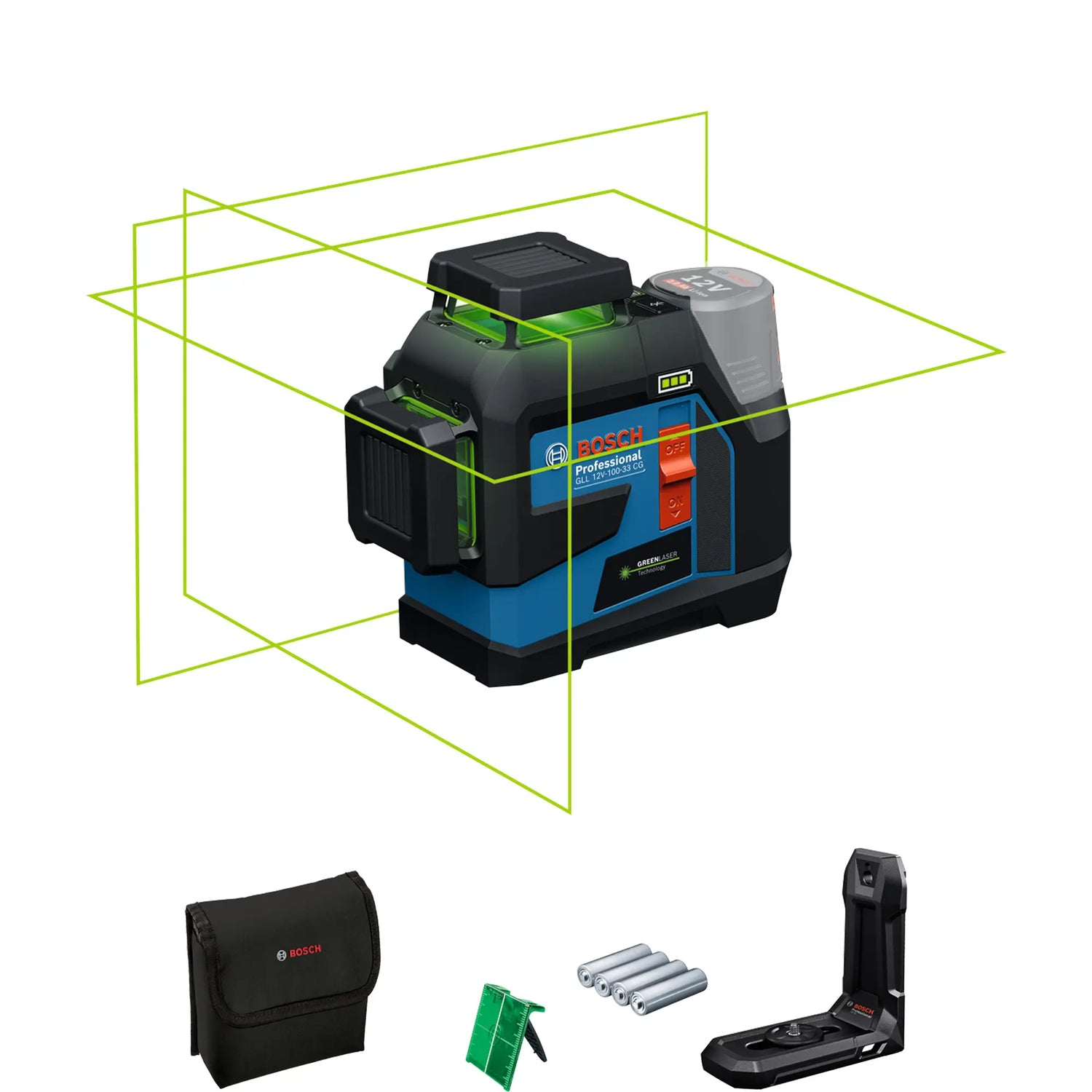 Livella Laser Bosch GLL 12V-100-33 CG 12V con 3 linee verdi a 360°, controllo remoto app e doppia alimentazione per massima versatilità.