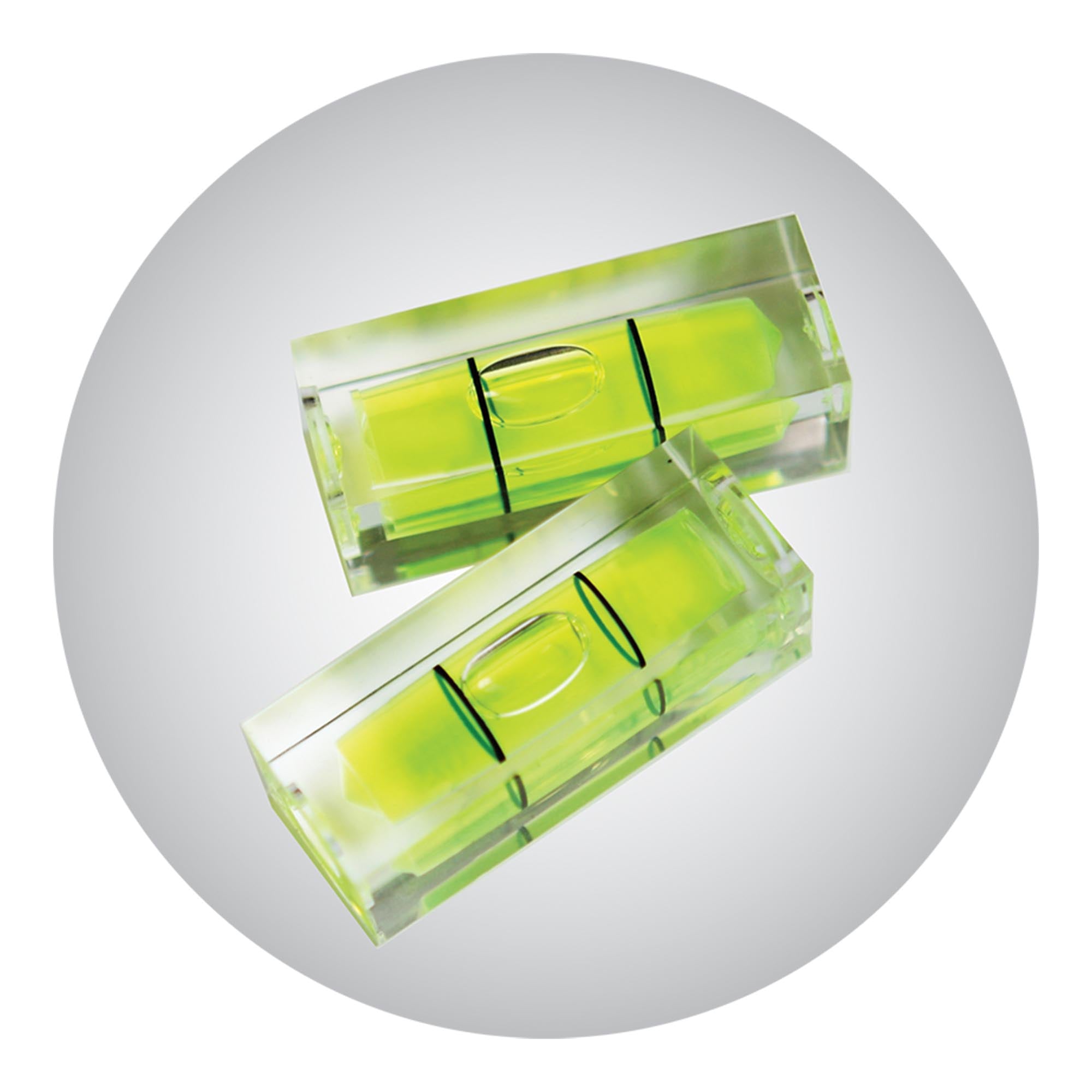 - Bubble vials made of shock-proof acrylic material calibrated with maximum precision at 0.5 mm/m (0.029°)