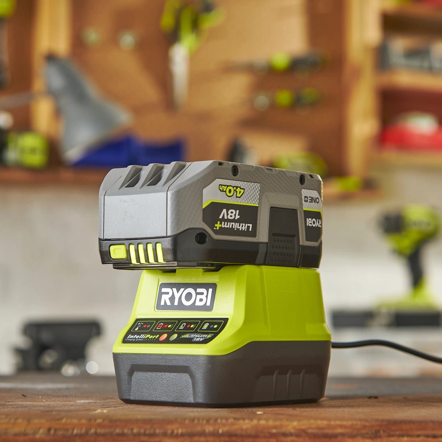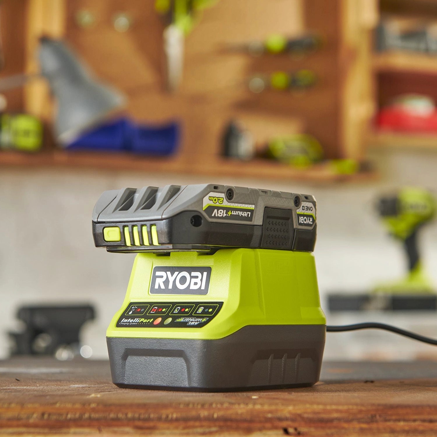 Battery charger Ryobi RC18120 18V fast and compact. Recharges a 2.0Ah battery in 1 hour. Compatible with all 18V ONE+ lithium batteries