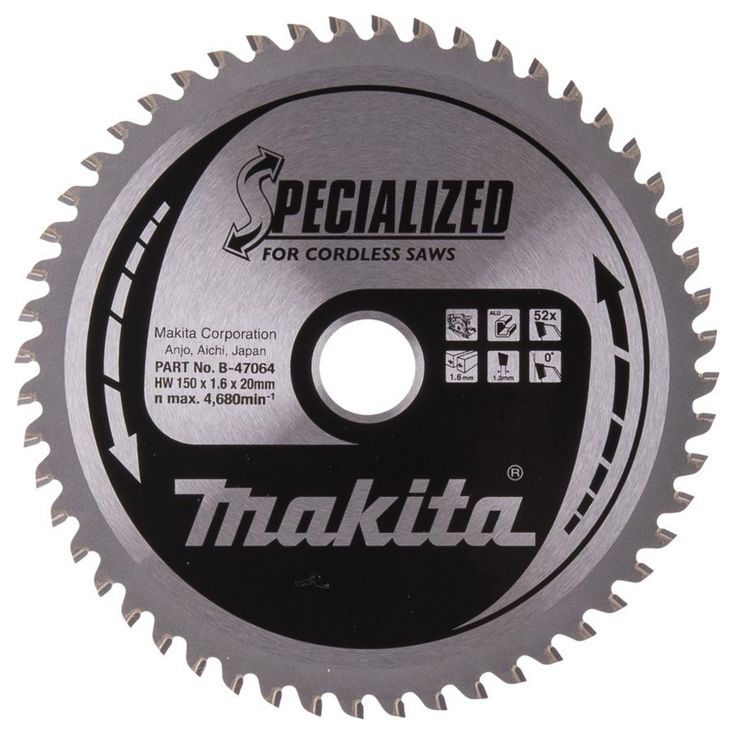 Circular Saw Blade Makita B-47064 150mm 52T tungsten carbide tipped aluminum saw. Specialized design optimized for battery-powered saws with lower energy consumption.