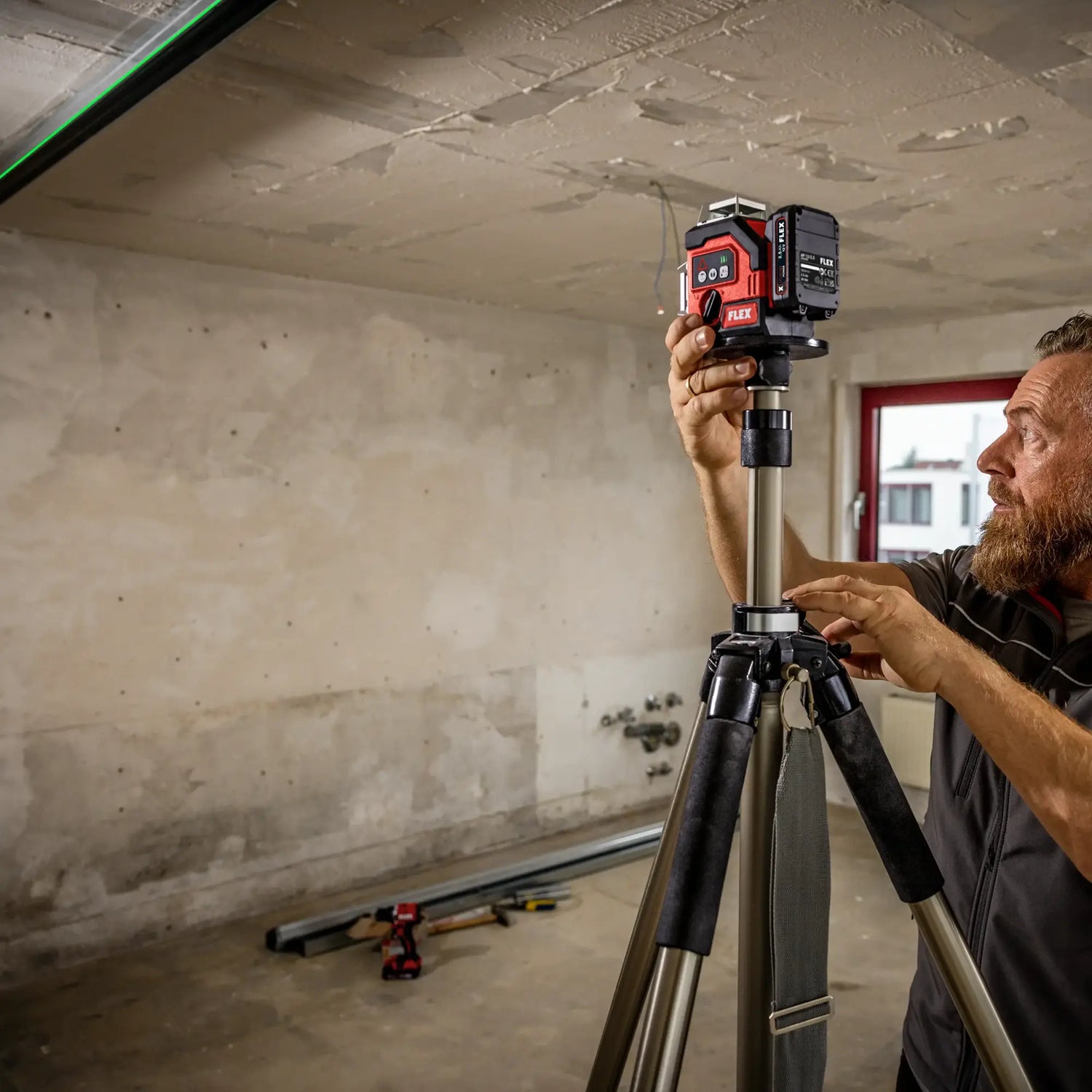 Questo kit completo FLEX ALC 3/360-G/R offre un sistema professionale pronto all’uso per allineamenti precisi, combinando laser a 360°, ricevitore per aumentare la portata e treppiede regolabile, per lavorare con precisione e continuità in ogni contesto operativo.