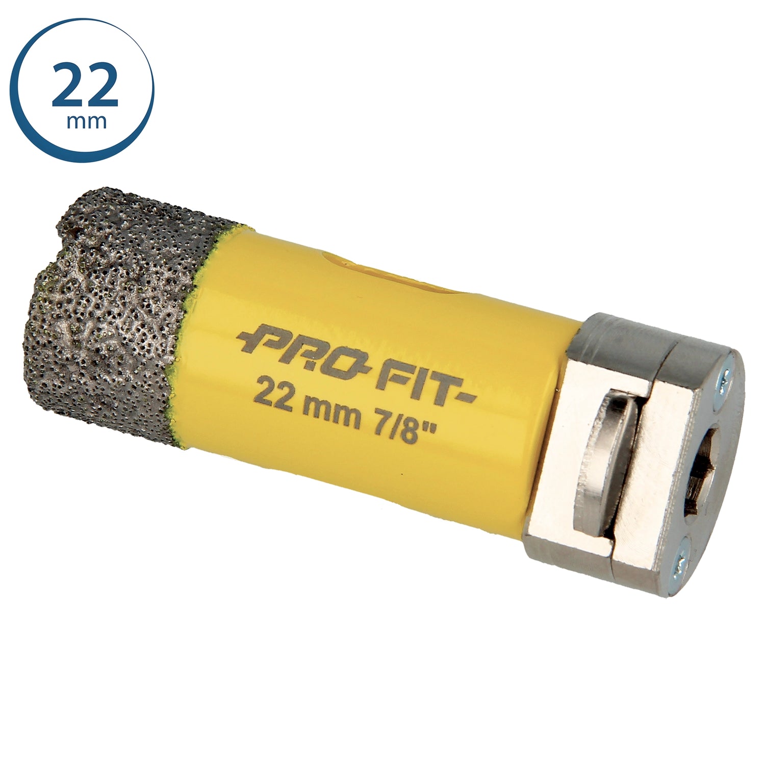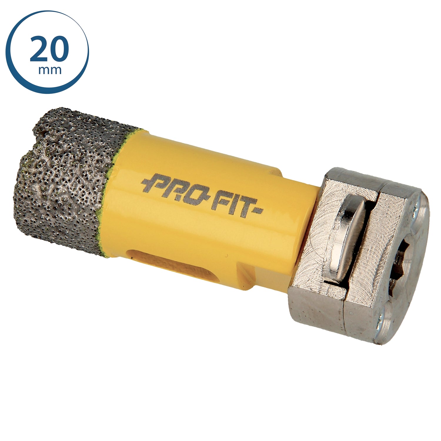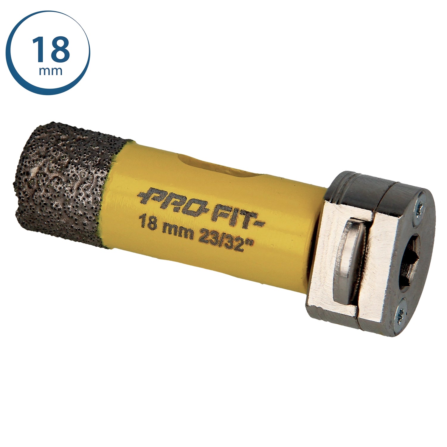 Cup Cutter ProFit Diamond Dry C&D with 18 mm adapter, supplied with the patented Click & Drill system, exclusive centering drill. Application in wall and floor coverings, natural stone such as marble and granite and glass fibre reinforced plastic. Tip: A rolling movement when drilling gives the best result.