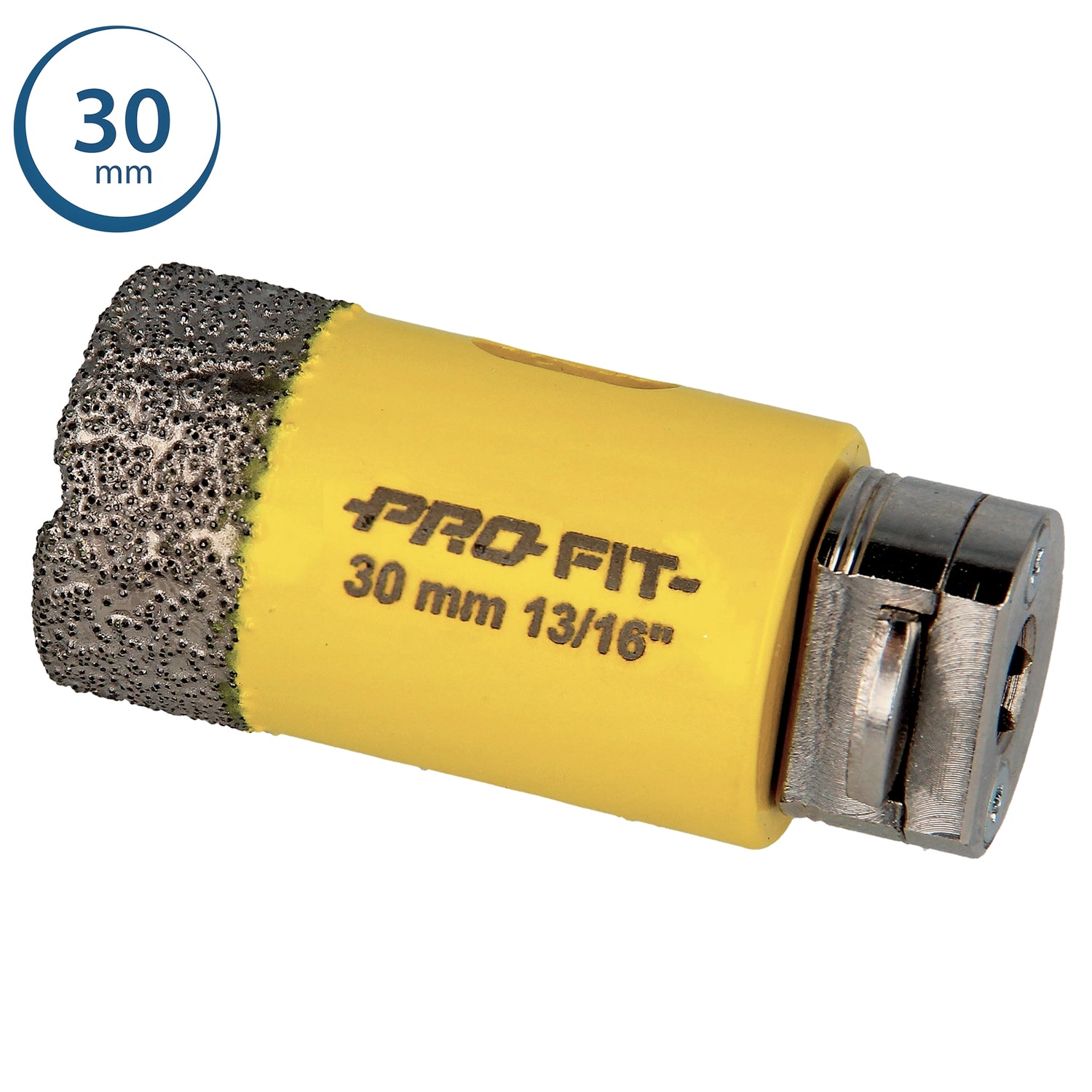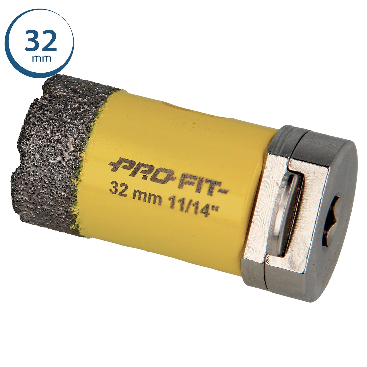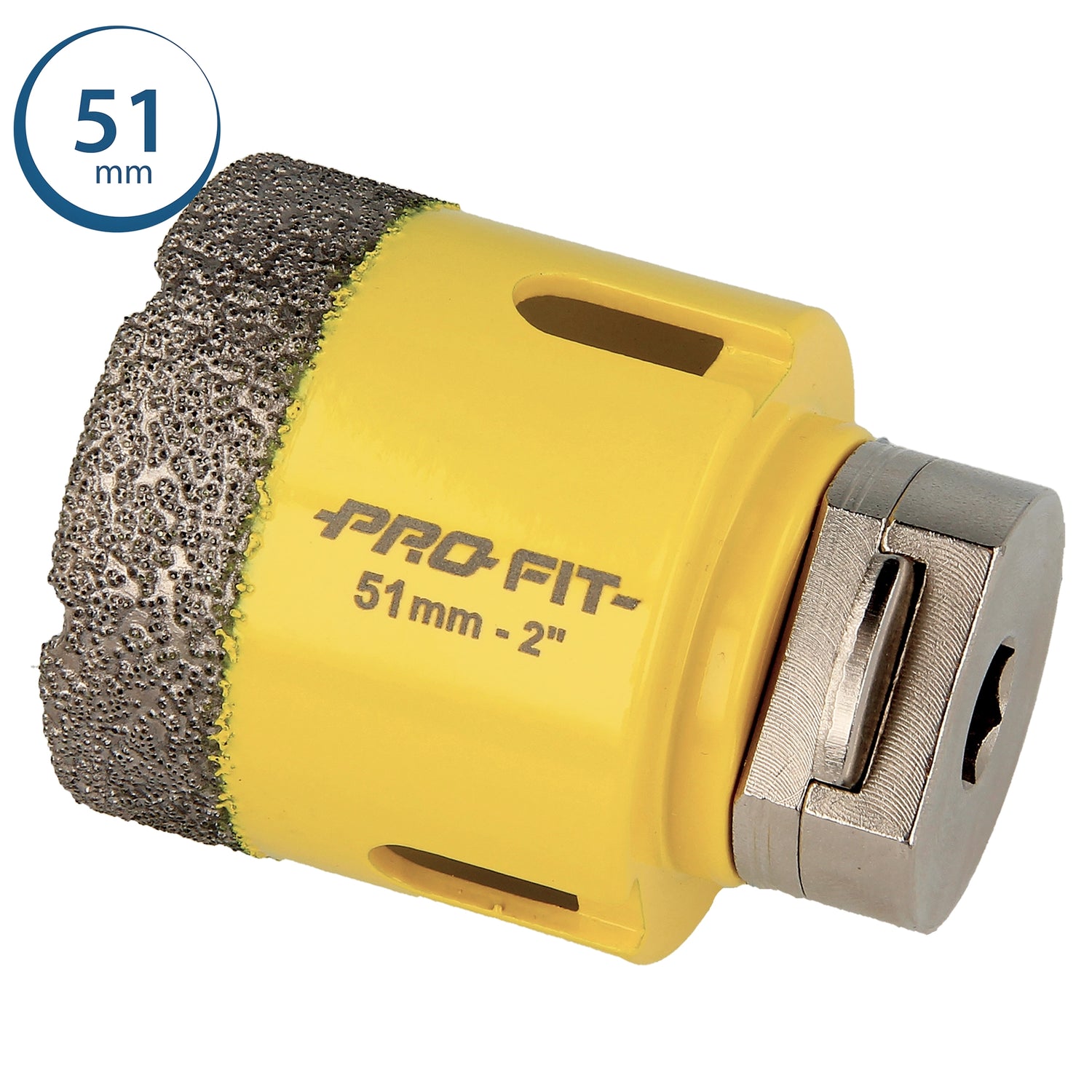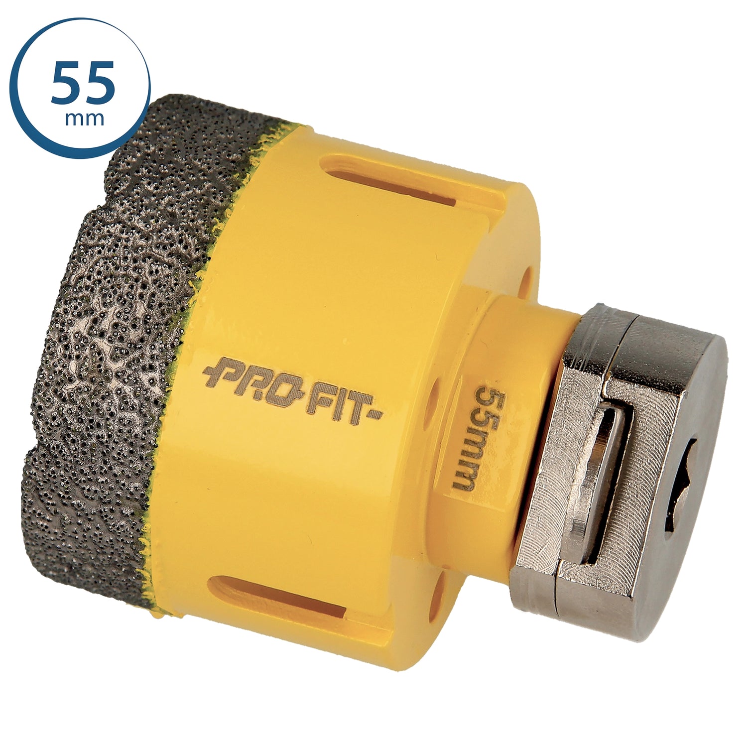 Cup Cutter ProFit Diamond Dry C&D with 18 mm adapter, supplied with the patented Click & Drill system, exclusive centering drill. Application in wall and floor coverings, natural stone such as marble and granite and glass fibre reinforced plastic. Tip: A rolling movement when drilling gives the best result.