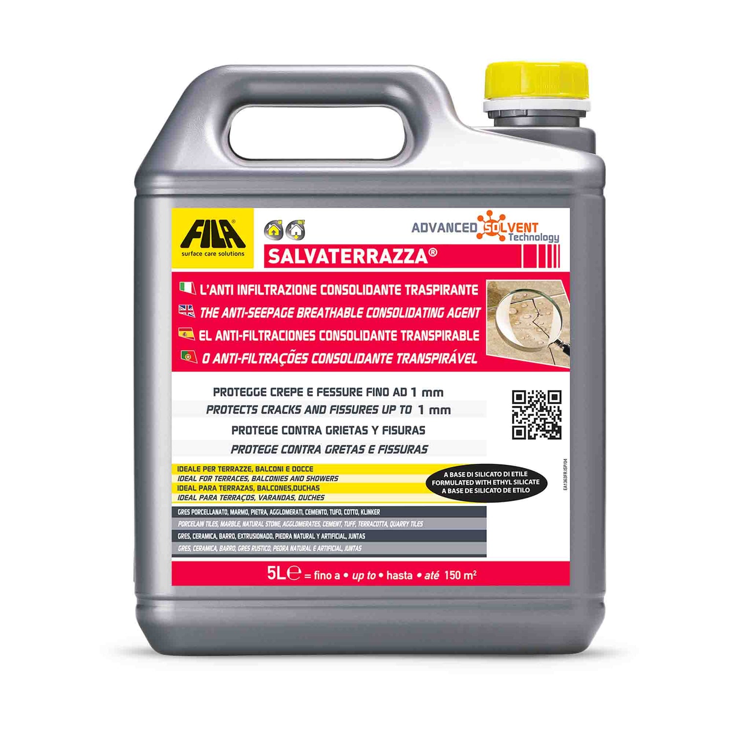 Anti-infiltration waterproofing SALVATERRAZZA line, consolidating and breathable. Ideal for porcelain stoneware, marble and stone, agglomerates, concrete, tuff, terracotta, klinker.