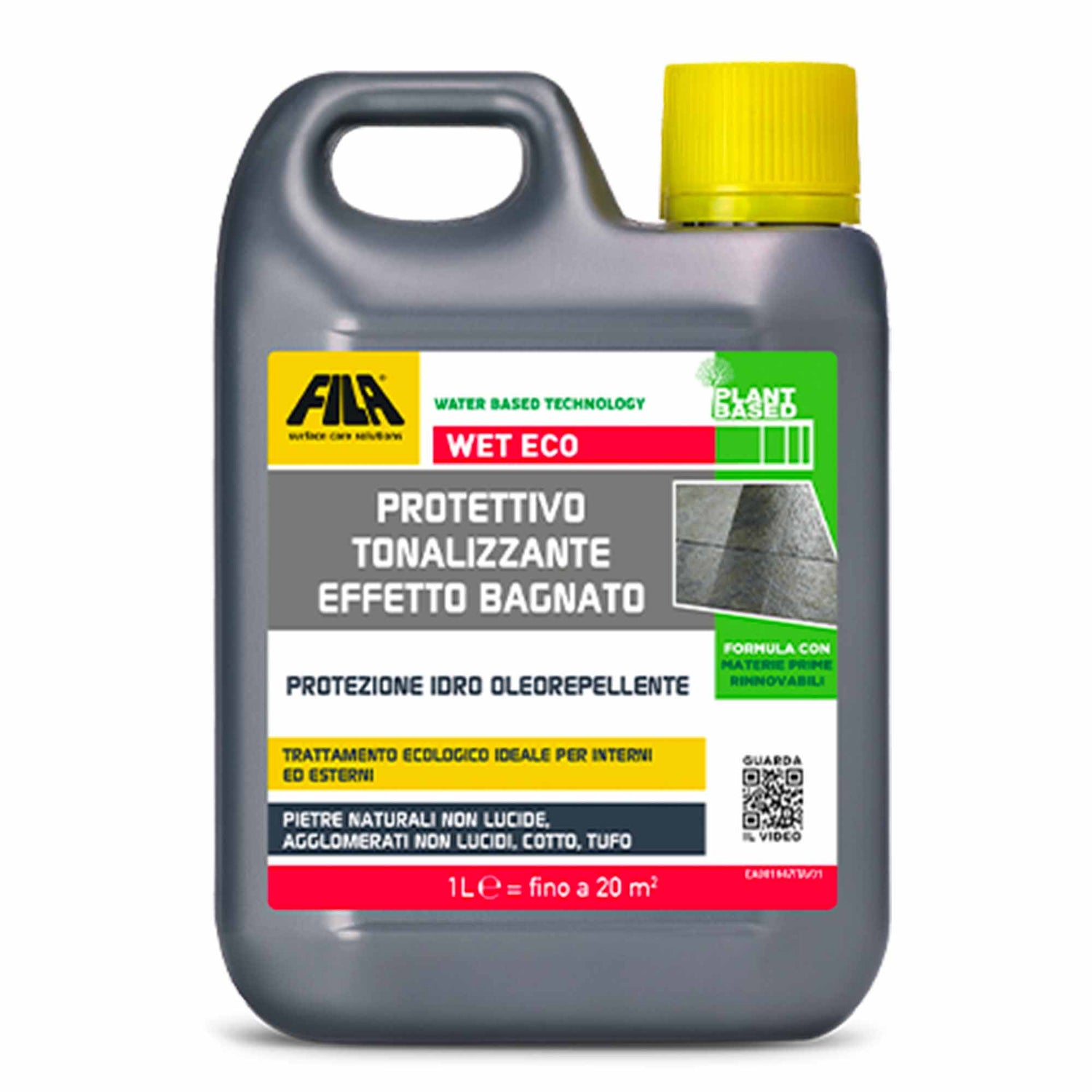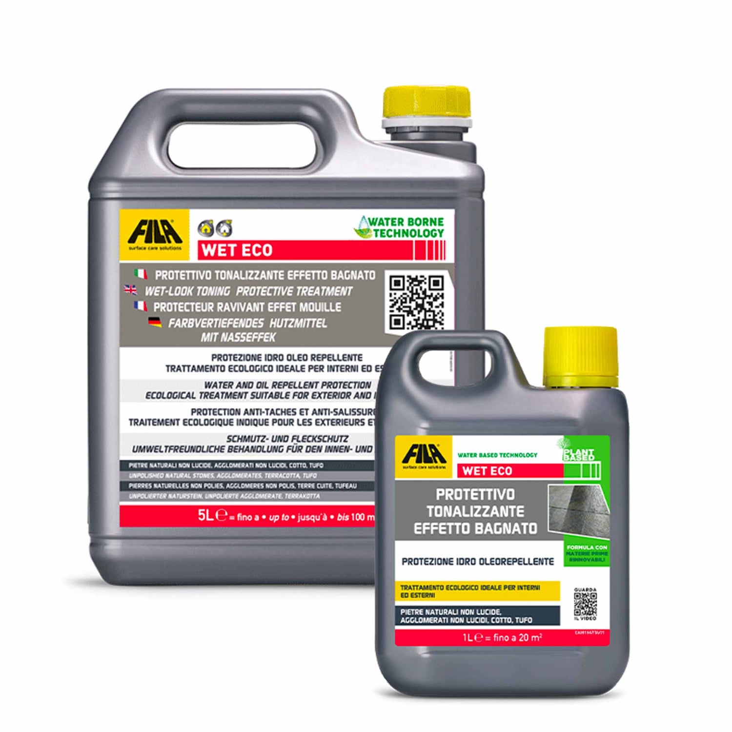 The Fila WET ECO Toning Protector is the ideal solution for preserving and protecting non-polished natural stone, non-polished agglomerates and terracotta surfaces, both indoors and outdoors. This eco-friendly water-based treatment offers stain and dirt protection with an elegant wet look, ensuring a surface resistant to atmospheric agents and heavy traffic.
