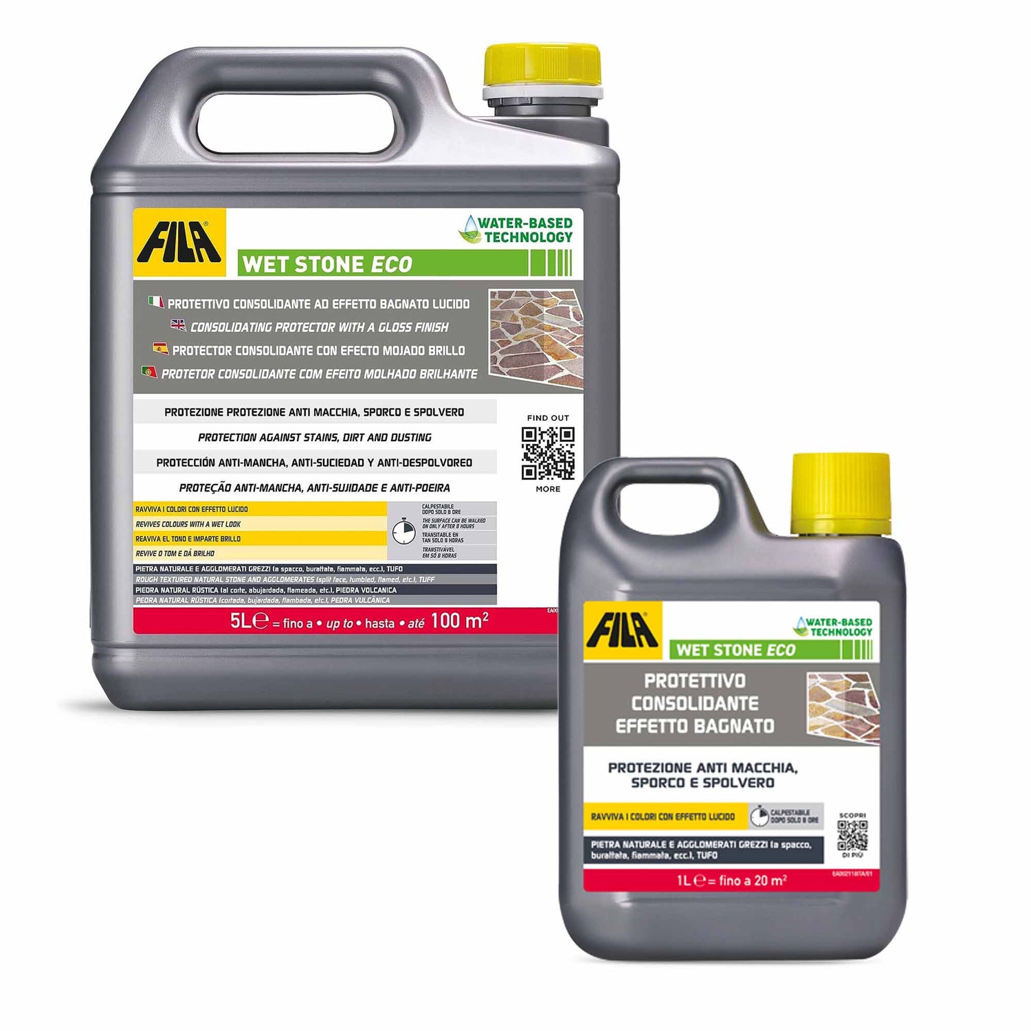 The Fila WET STONE ECO Consolidating Protector is the perfect solution to protect and revive natural stone and rough agglomerate surfaces, giving them a pleasant wet effect. Thanks to its ecological water-based formulation, this product offers dirt and stain protection ideal for both interiors and exteriors.