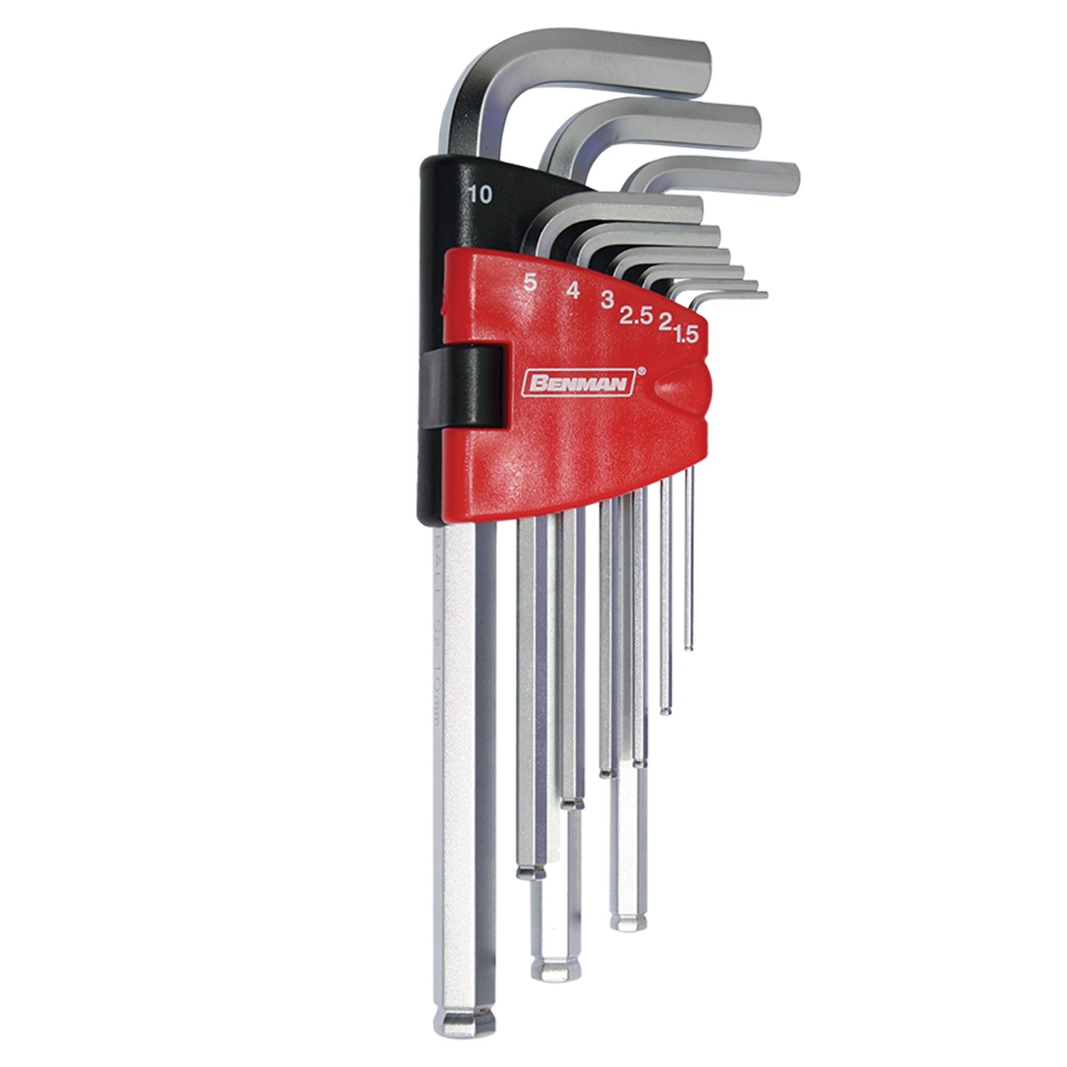 Long Hex Key Set Benman 9 pcs, with patented turball head that combines a straight head with a turball type head.