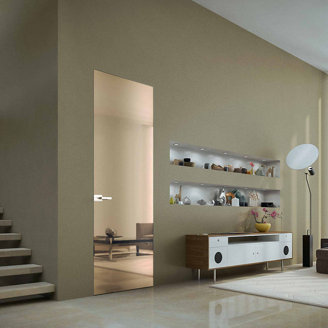 There Hinged Door Scrigno Essential Mirror Glass H2100 it is the perfect synthesis of reflections of light And transparency, with a design that blends harmoniously with the environment. The model flush with the wall it is completely coplanar to the wall, without jambs or architraves, creating an effect of continuity between the rooms. Available in the versions Mirr1 single glass or Mirr2 double glass, this door combines beauty and functionality, perfect for those looking for an element that enhances their space.