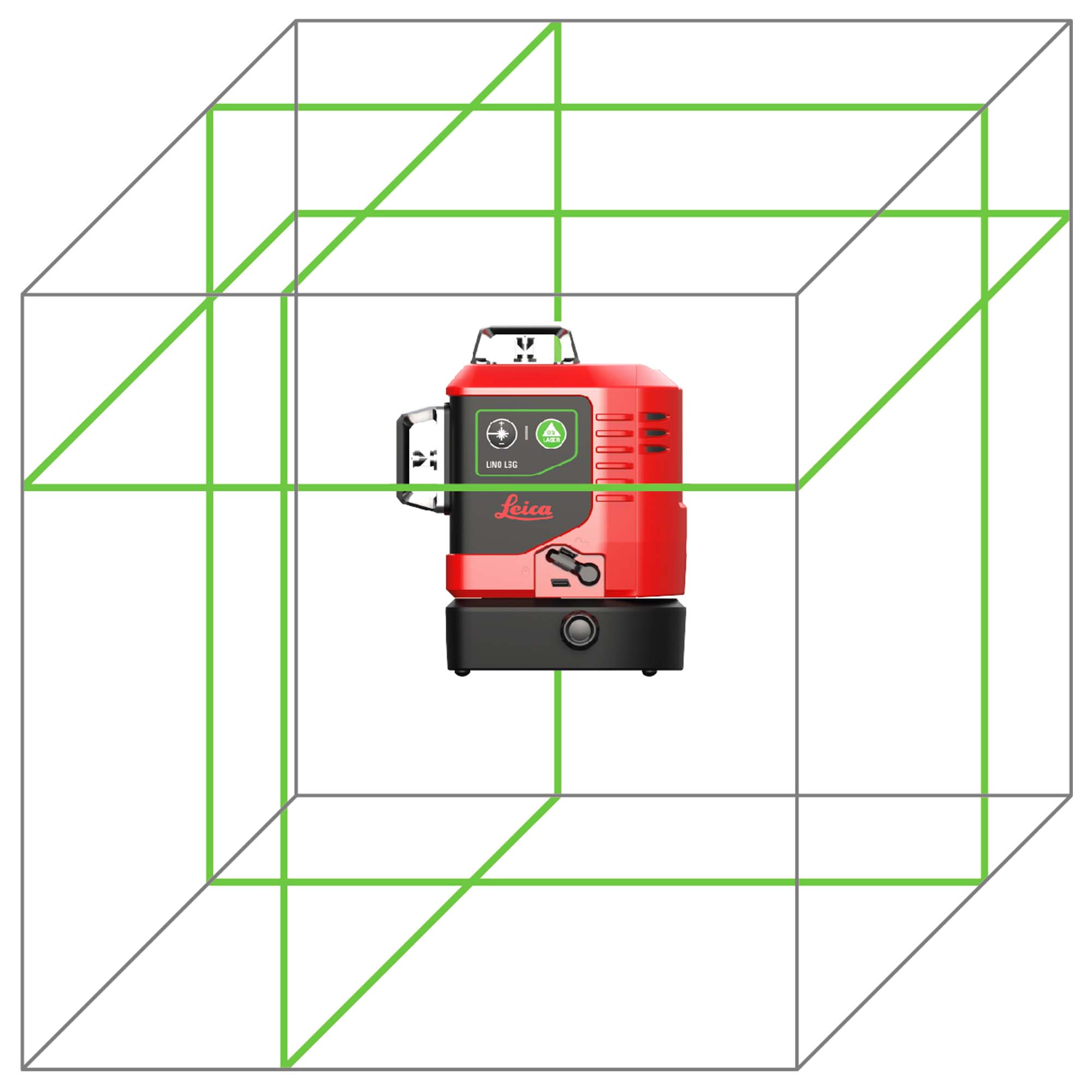 • One horizontal and two vertical green laser lines that cover the entire room, simplifying every alignment operation on walls, ceilings and floors.