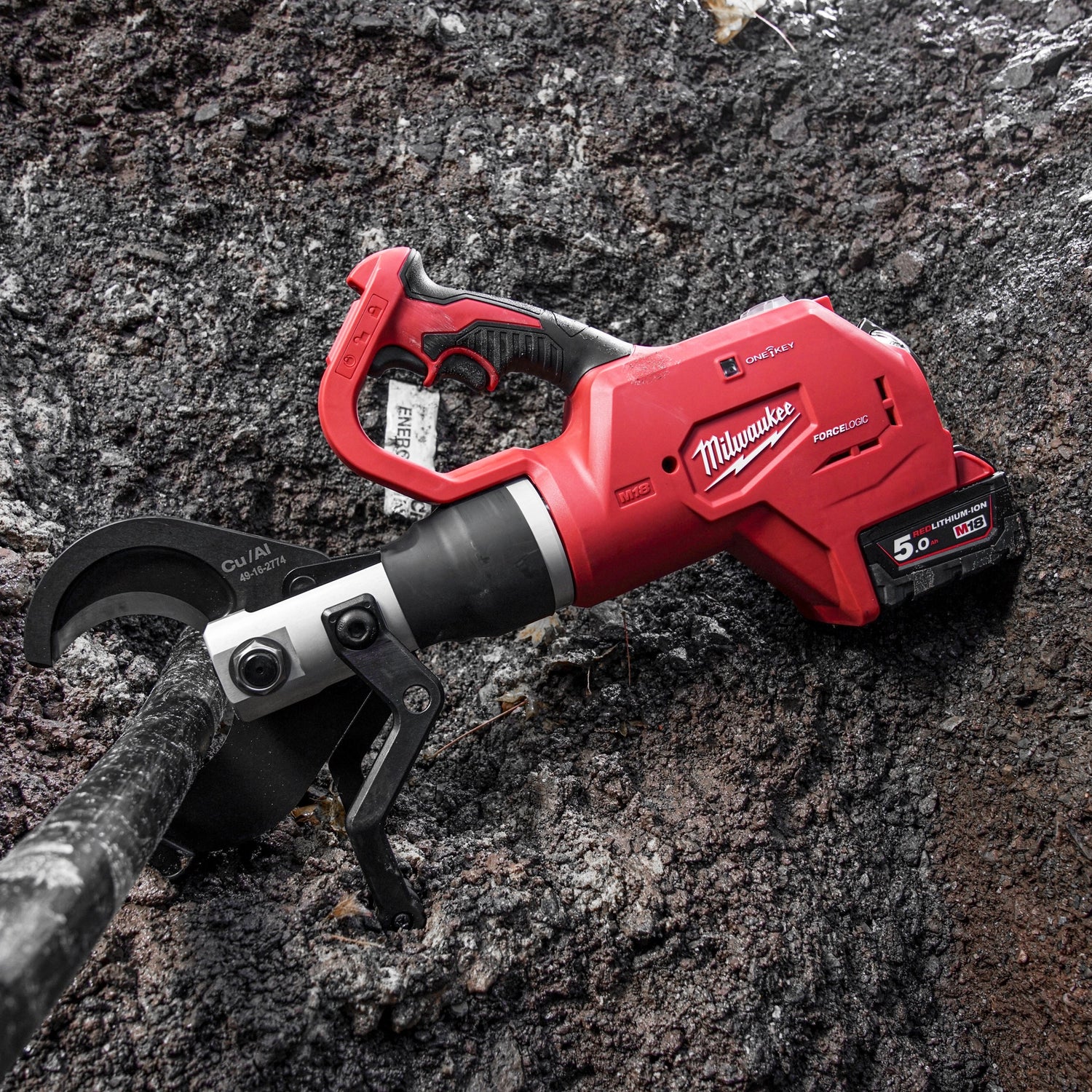 Cable cutter Milwaukee M18 HCC75R-502C 18V 5Ah, FORCE LOGIC capable of cutting cables in less than 10 seconds with 77.8 kN of force. The wireless remote control communicates with the tool via a Bluetooth connection, removing any physical connection to the tool and allowing the user to make remote cuts up to 30 m