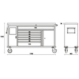 • 7 Large Drawers: Six 782x406mm drawers (5 x 65mm high and 1 x 145mm) and one 1248x406mm long drawer, all mounted on ball bearing telescopic slides for smooth and safe opening.