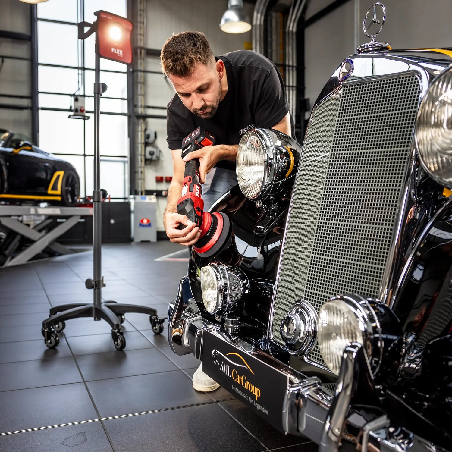 There Flex The PE 2 18-EC C 18V is designed for removing deep scratches, restoring paintwork that has been severely damaged by weather, and providing professional surface finishing. It's as powerful as a corded polisher throughout the battery life, ensuring consistent performance and maximum freedom of movement.