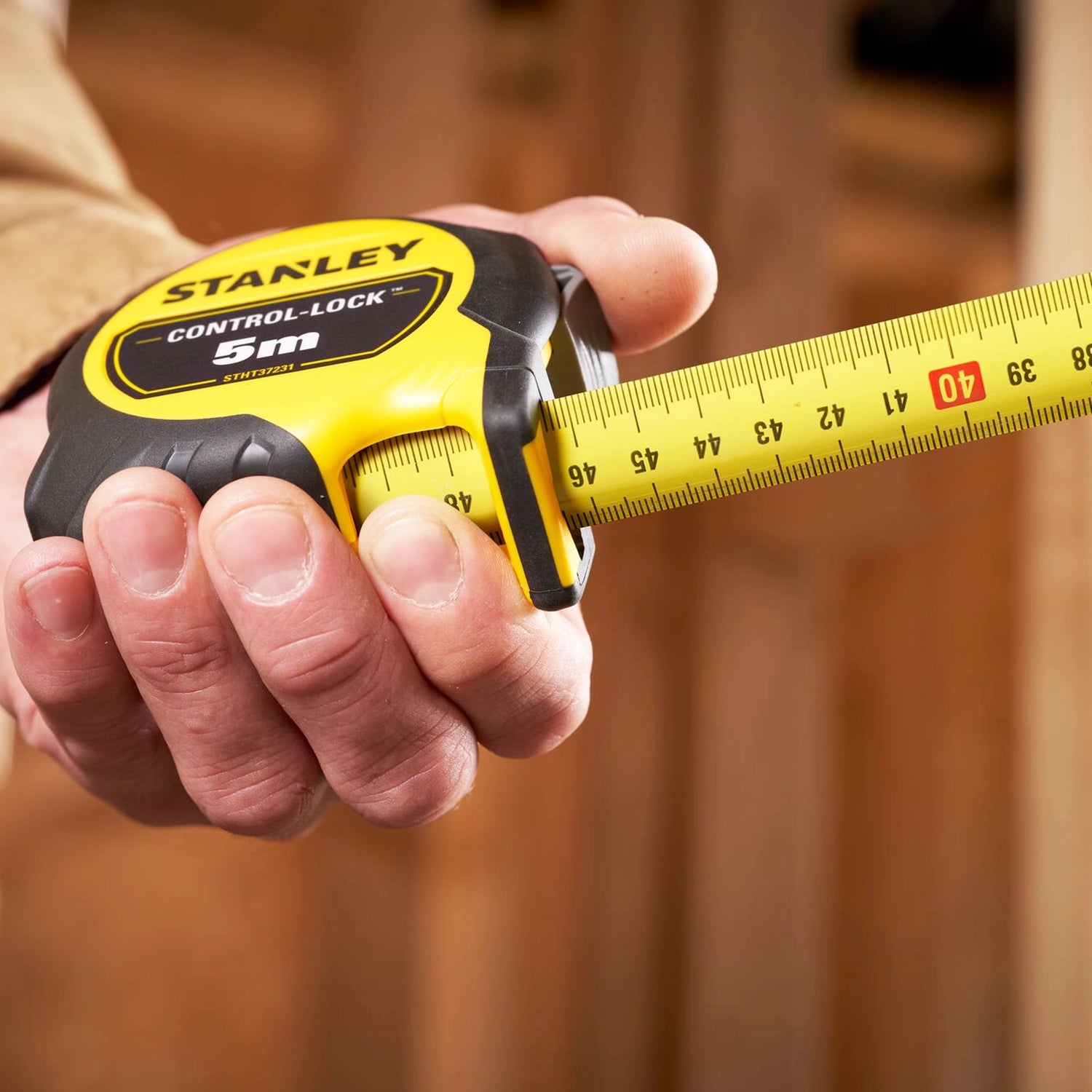 Tape measure Stanley STHT37231-0 from 5 meters llight and compact with rubber coating. Tape measure CONTROL-LOCK™ belt width 25mm.