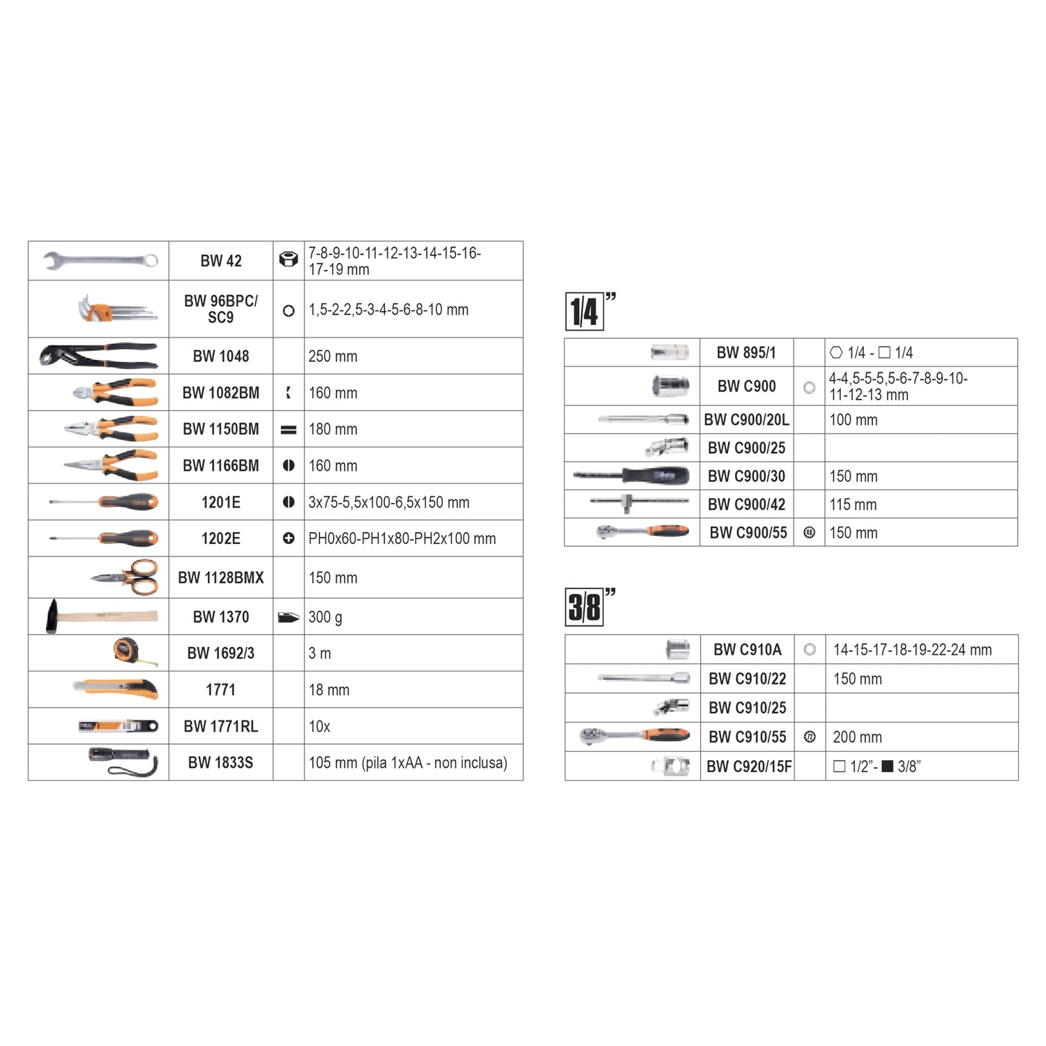 • Wide Range of Tools: The 2054E 100 offers a complete set of 100 tools, while the BW 2054E-128 includes 128 tools to tackle general maintenance jobs efficiently and flexibly.